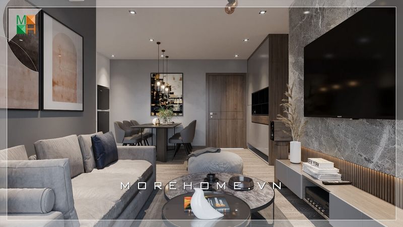 Thiết kế sofa hiện đại với vỏ bọc vải tiện lợi mang lại cảm giác tiện lợi, thoải mái thoáng đãng cho không gian phòng khách căn hộ chung cư.
