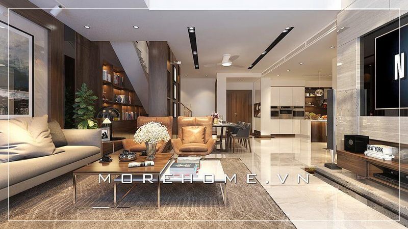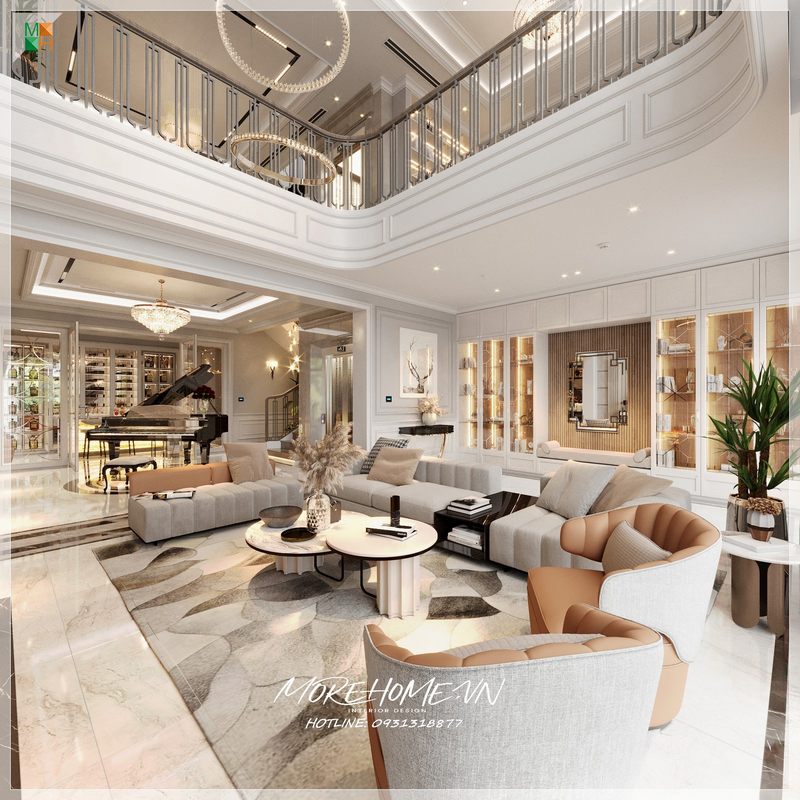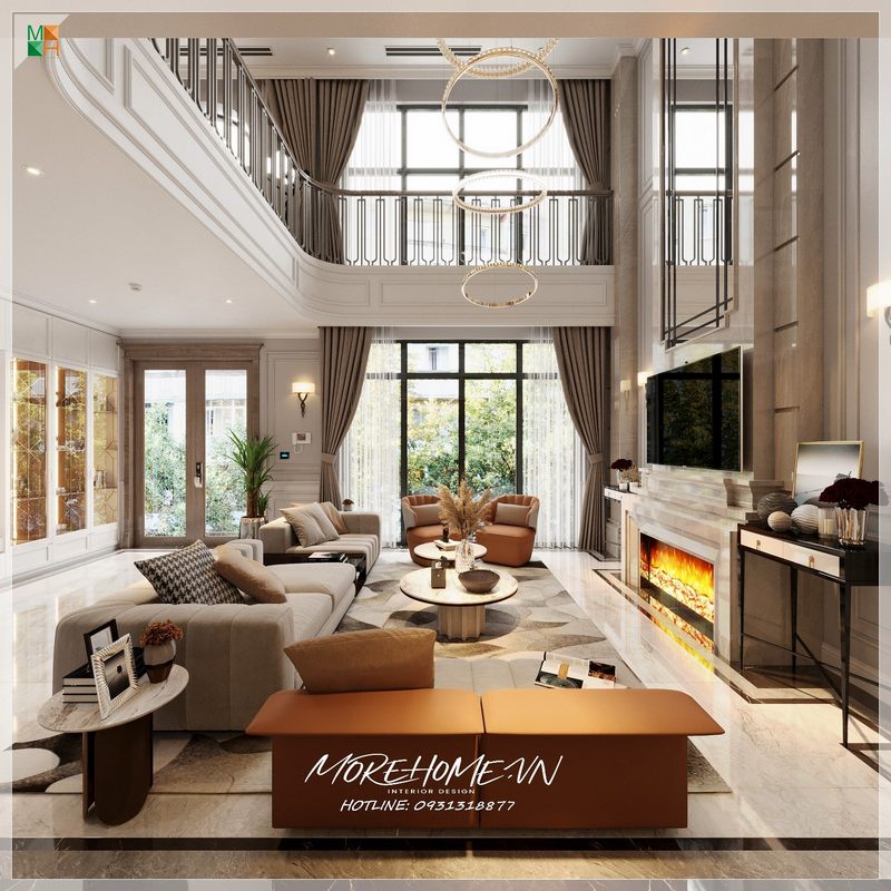 Phòng khách thông tầng 1 không gian trang hoàng, hiện đại xuất hiện không gian nhà biệt thự, căn hộ duplex, penthouse và nhà phố. Đây là không gian mang tính thẩm mỹ cao trong mỗi căn phòng.