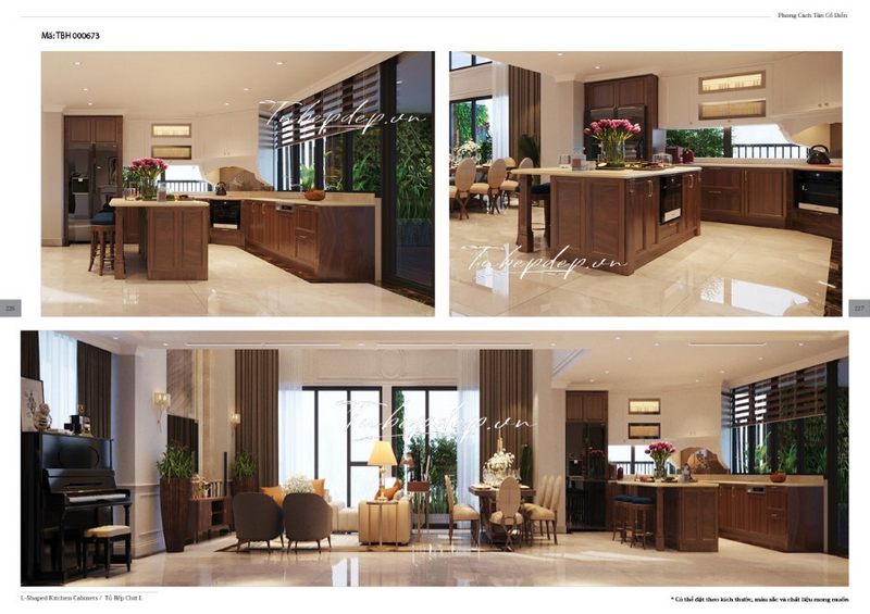 Tư vấn thiết kế phòng bếp trong không gian mở, sử dụng gỗ óc chó thiết kế theo phong cách tân cổ điển màu nâu đẳng cấp xứng tầm trong biệt thự, nhà phố, chung cư cao cấp.