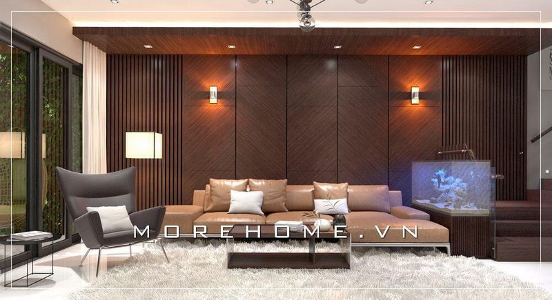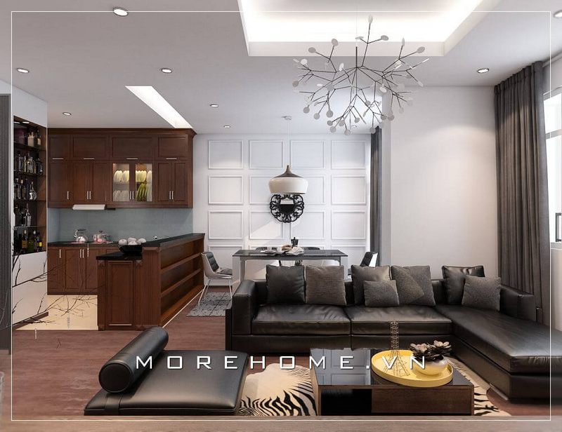 Mẫu sofa hiện đại với kiểu dáng góc L bọc da màu nâu mang đến cảm giác ấm cúng, thử giãn cho phòng khách chung cư