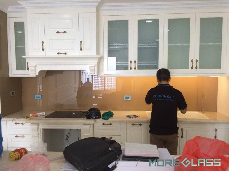 Thi công kính ốp bếp cường lực kính màu nhũ cam vàng cho chung cư, biệt thự, nhà phố