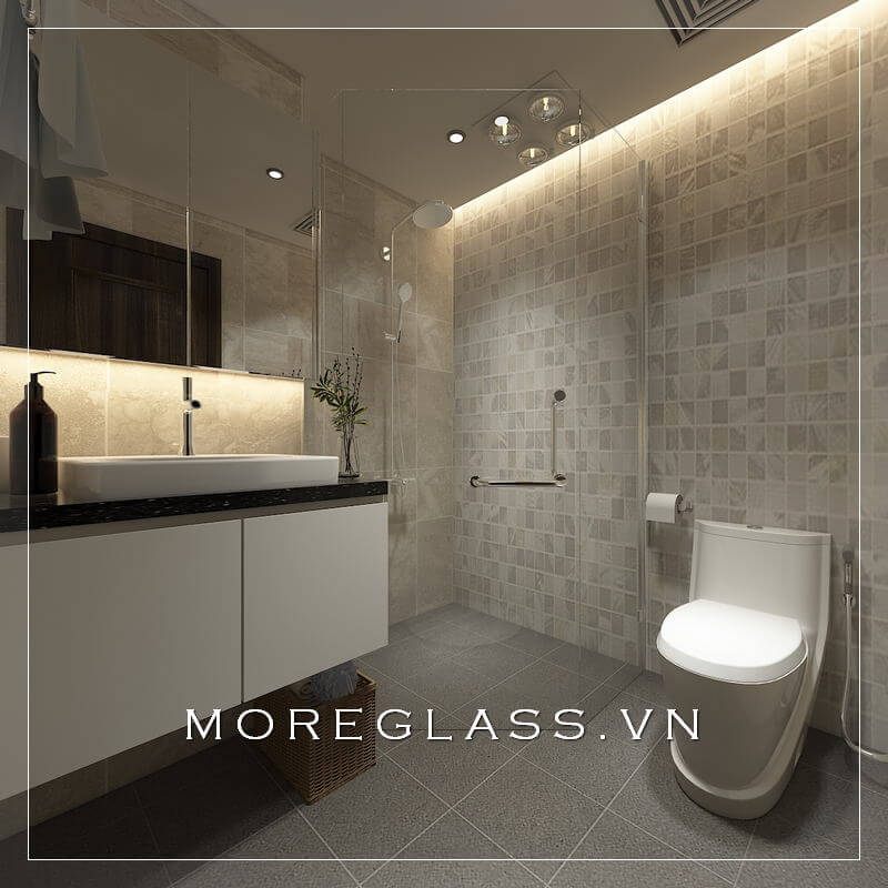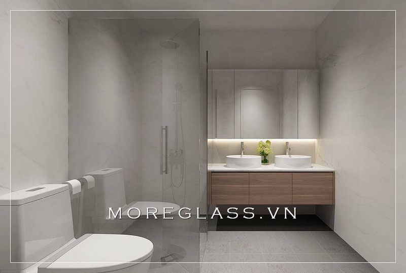 Mẫu thiết kế phòng tắm kính hiện đại cho khách sạn kết hợp nội thất và thiết bị vệ sinh cao cấp.