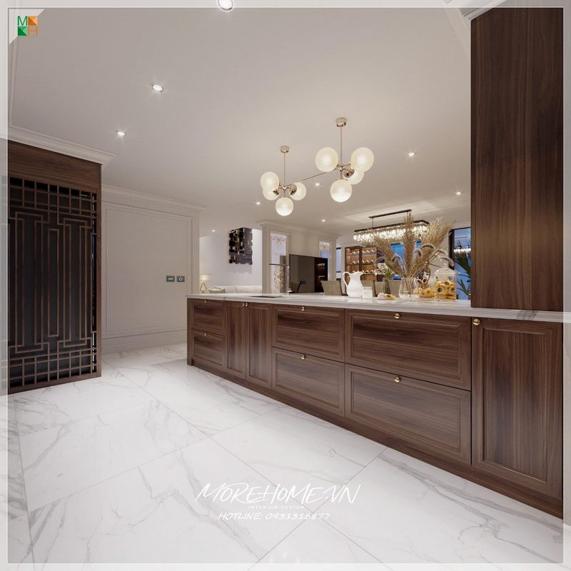 Với lối thiết kế gần như âm tường, tạo mặt phẳng gọn gàng, nội thất phòng bếp giúp tiết kiệm một diện tích đáng kể, tạo không gian trống lớn đảm bảo theo mong muốn của gia chủ, phù hợp với các hoạt động sinh hoạt, vui chơi của cả gia đình