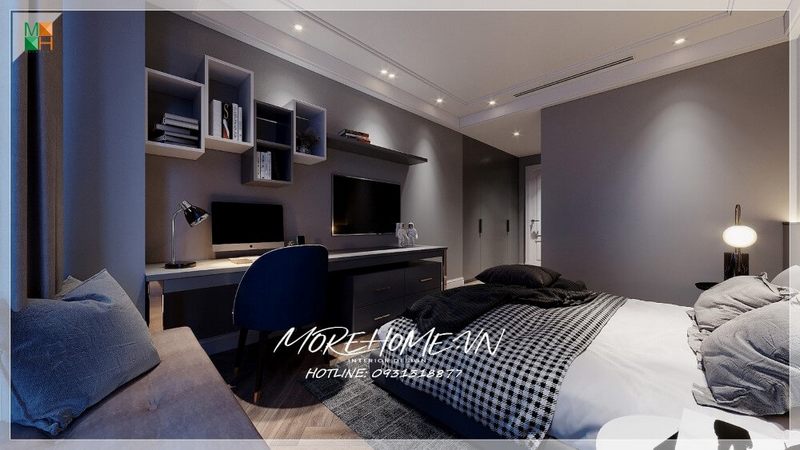 Trang trí phòng ngủ có bàn làm việc nội thất sắp xếp theo từng khu vực, không gian khác nhau phục vụ tốt cho mục đích sử dụng của gia chủ không gian nghỉ ngơi thư giãn thoải mái tiện nghi.
