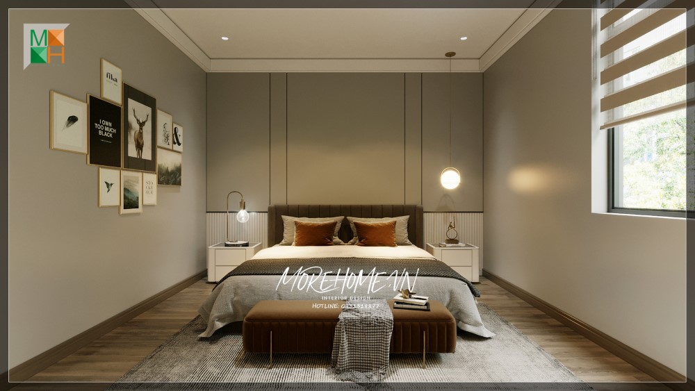 Bố trí phòng ngủ đẹp cho nhà phố hiện đại, chiếc giường ngủ bọc nỉ cách điệu đầu giường trở thành điểm nhấn ấn tượng cho cả không gian căn phòng