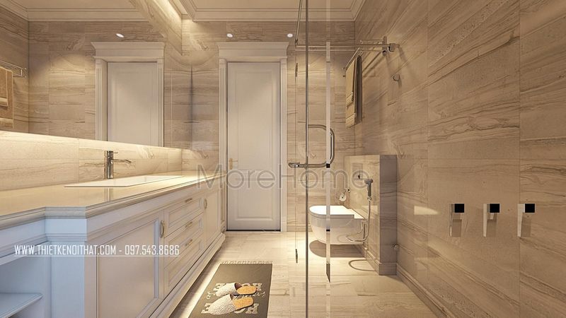 Phòng tắm sử dụng với tông màu trầm, không gian gọn gàng, sáng, tiện lợi dễ dàng cho việc dọn dẹp vệ sinh