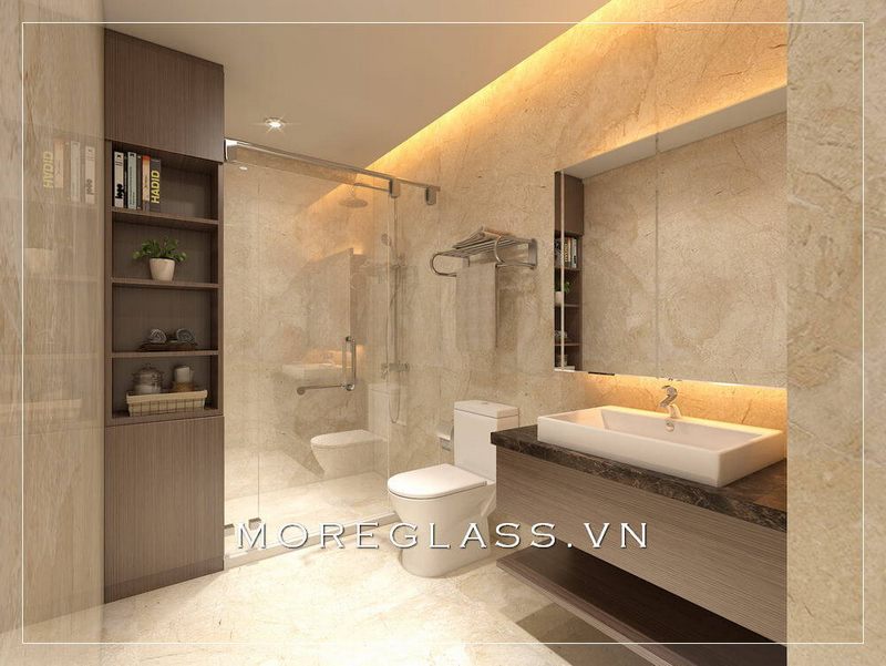 Phòng tắm hiện đại được thiết kế với các kệ tủ trang trí, tủ lavobo gỗ công nghiệp cao cấp và các thiết bị vệ sinh thông minh, giúp căn phòng tắm trở nên đầy đủ tiện nghi.